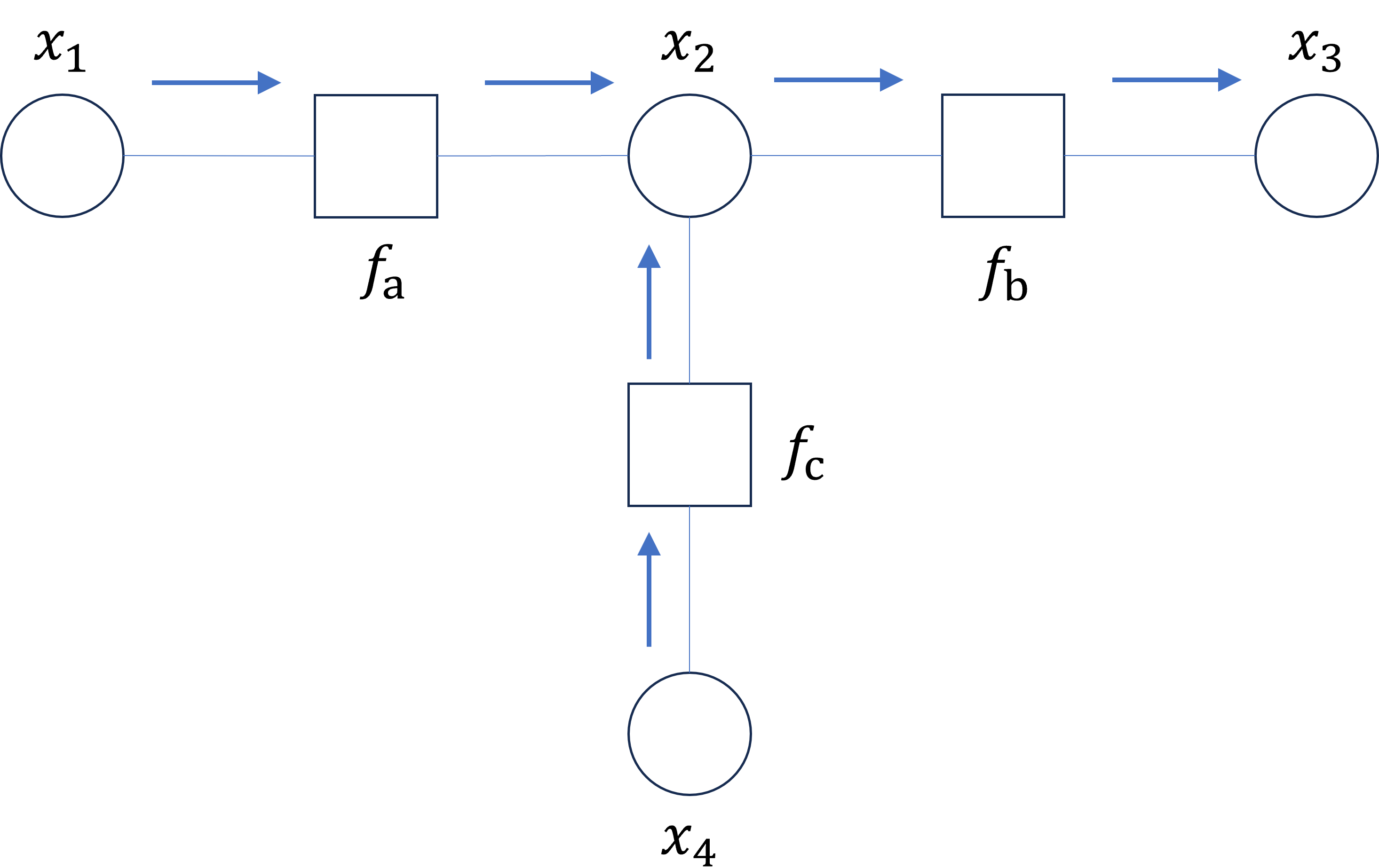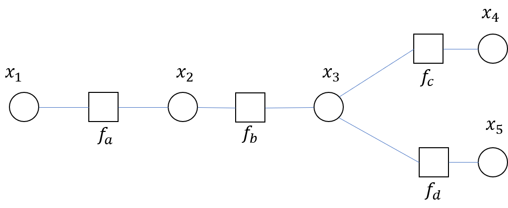 $x_1$, $x_2$ 등에 해당하는 노드들은 변수 노드(variable node), $f_a$, $f_b$ 등에 해당하는 노드들은 인자 노드(factor node) 혹은 함수 노드(function node)라고 불릴 것이다.